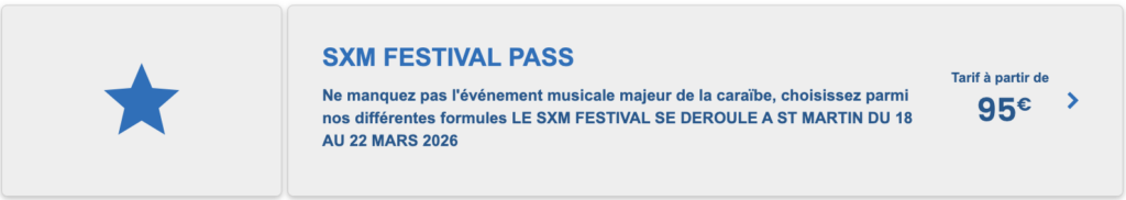 Les pass sont liés à ces dates et conditions précises. Il est important de suivre le process de réservation classique en choisissant les dates correspondantes au SXM Festival.